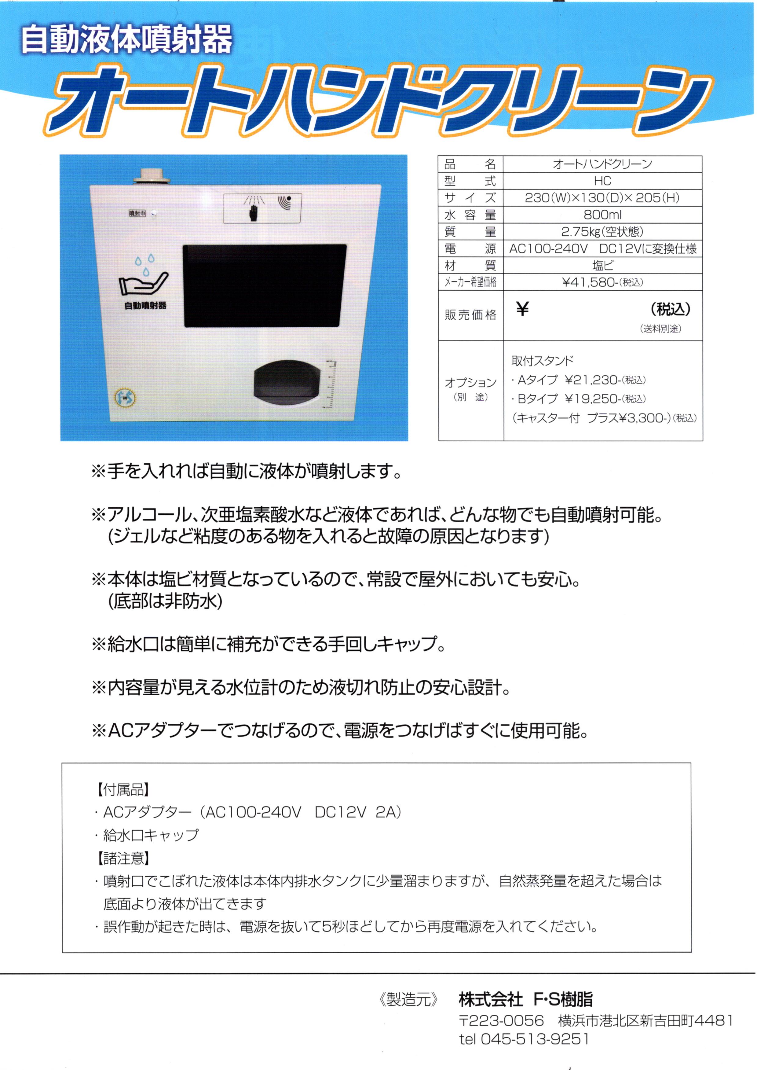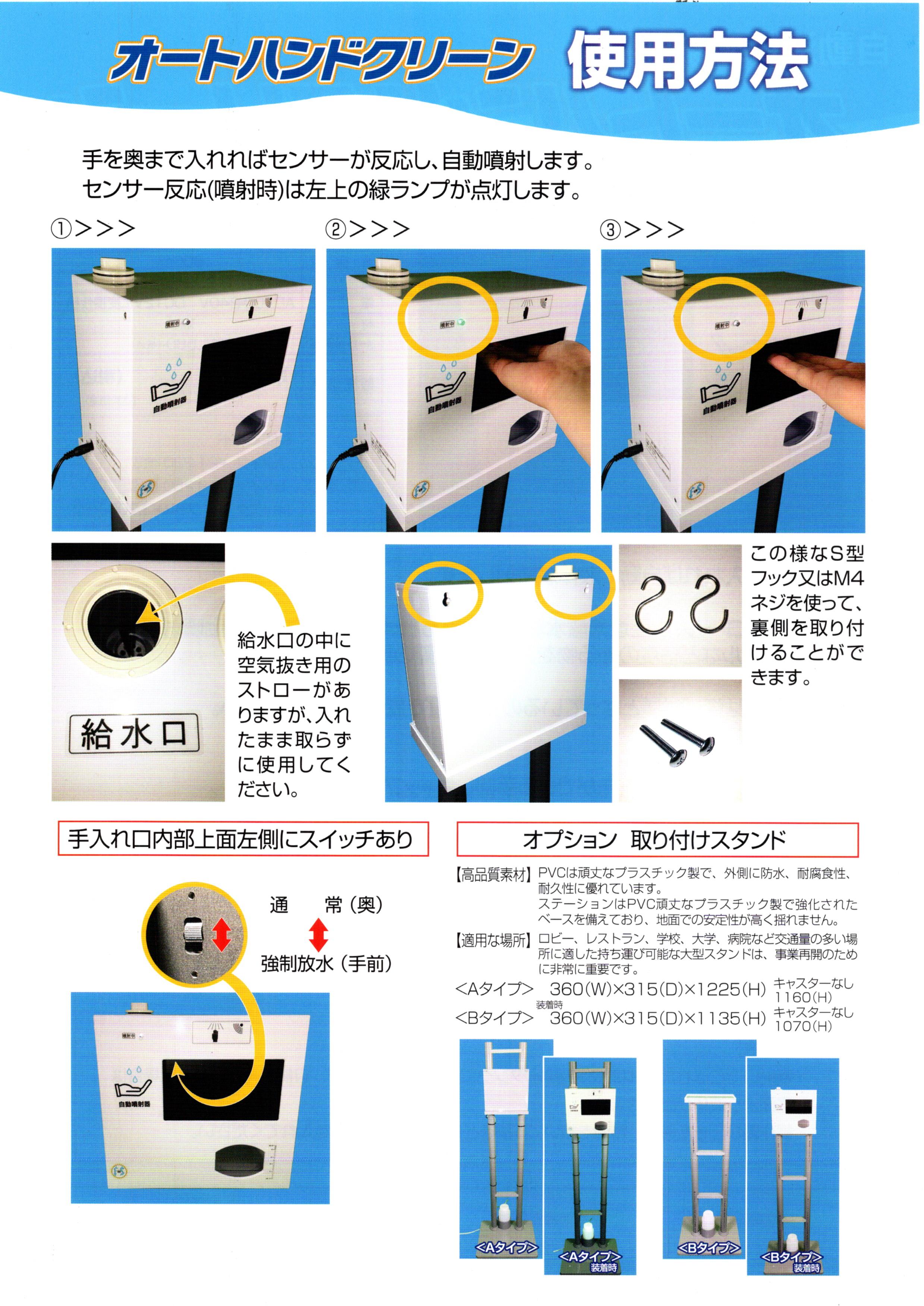 今現在、出回っている商品のほとんどは、乾電池式や手又は足のプッシュ式で屋内用ですが、自社製品はACアダプター使用で屋外に設置することができる商品です。